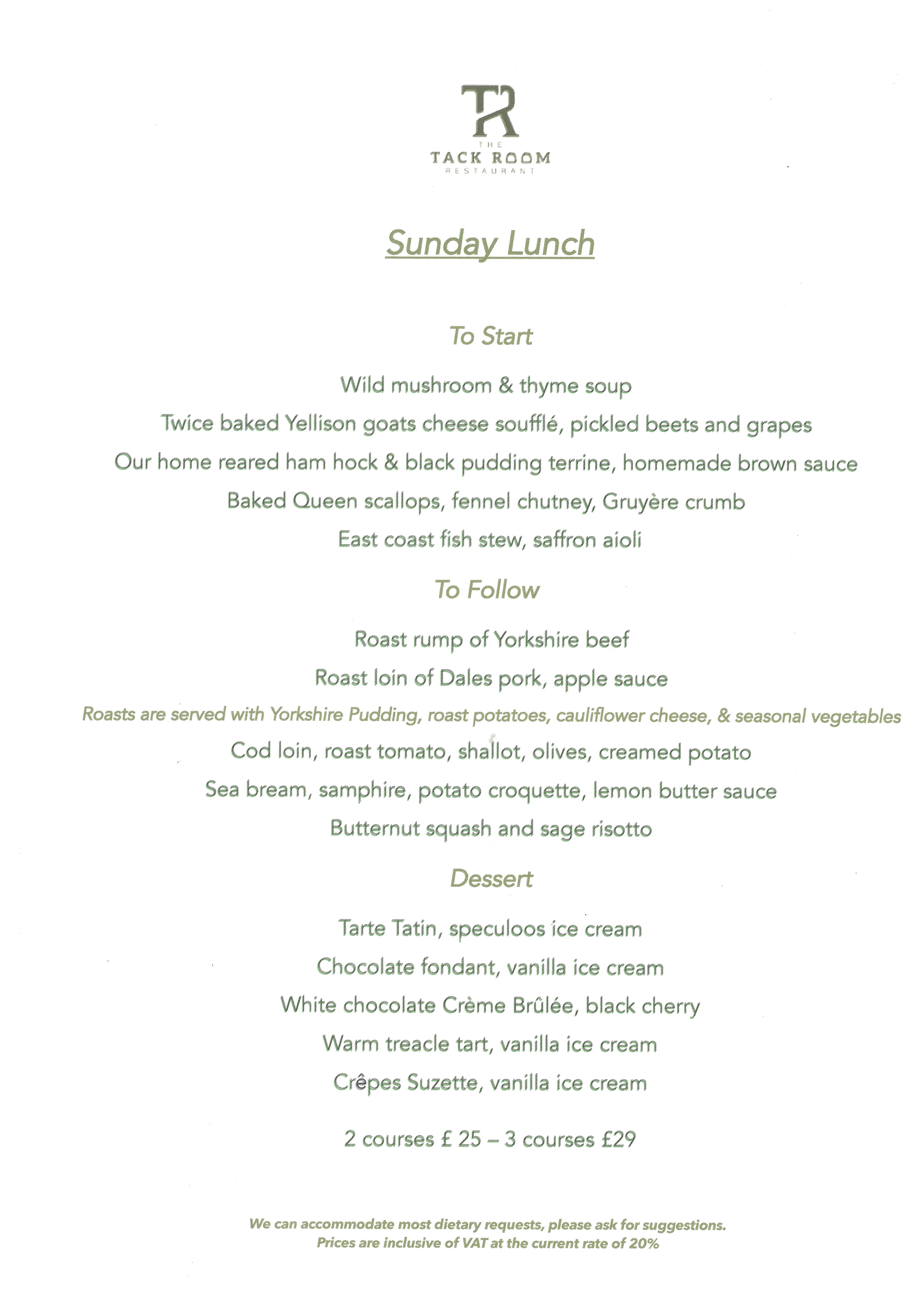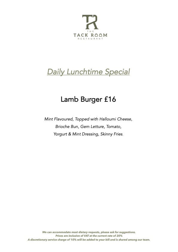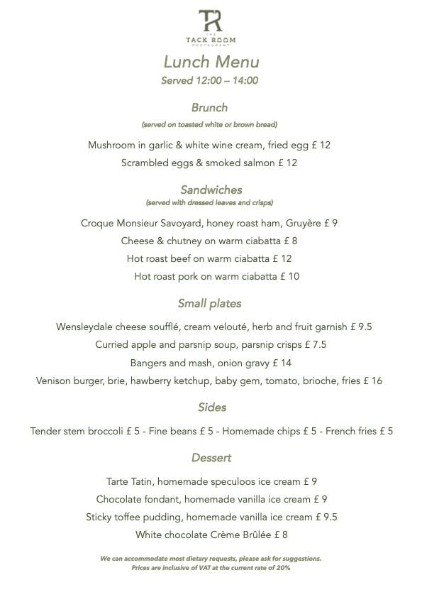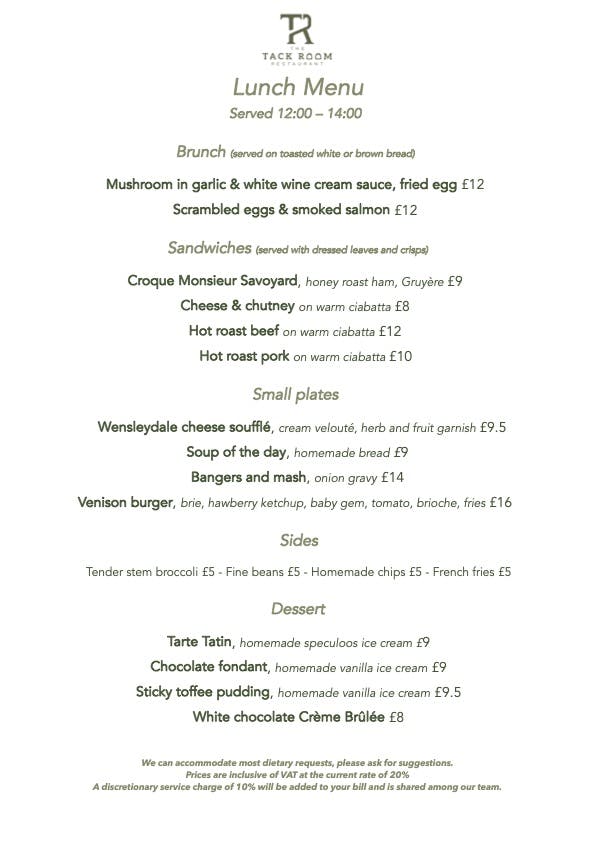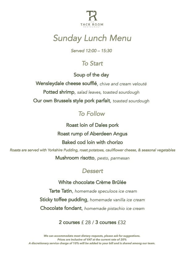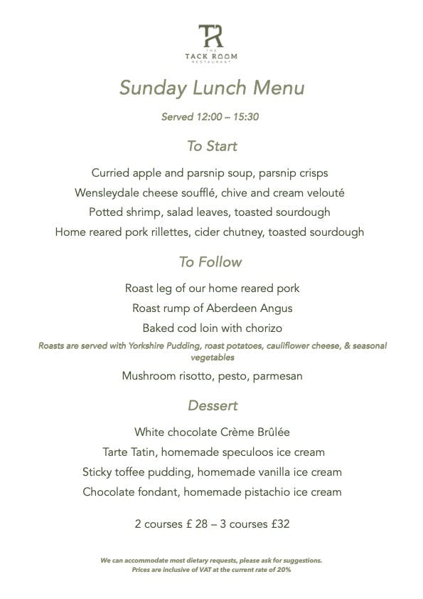 Sunday Lunch is served in The Tack Room Restaurant 12:00 - 16:00