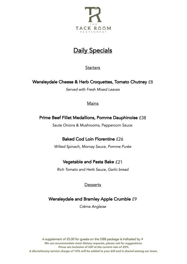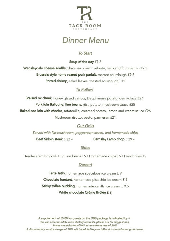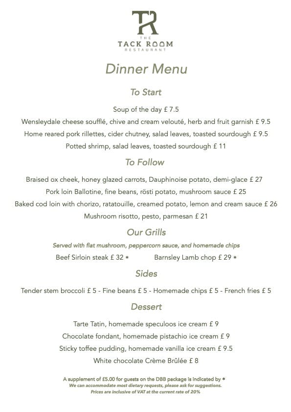 Dinner in The Tack Room Restaurant served Wednesday - Saturday 18:00 -21:00