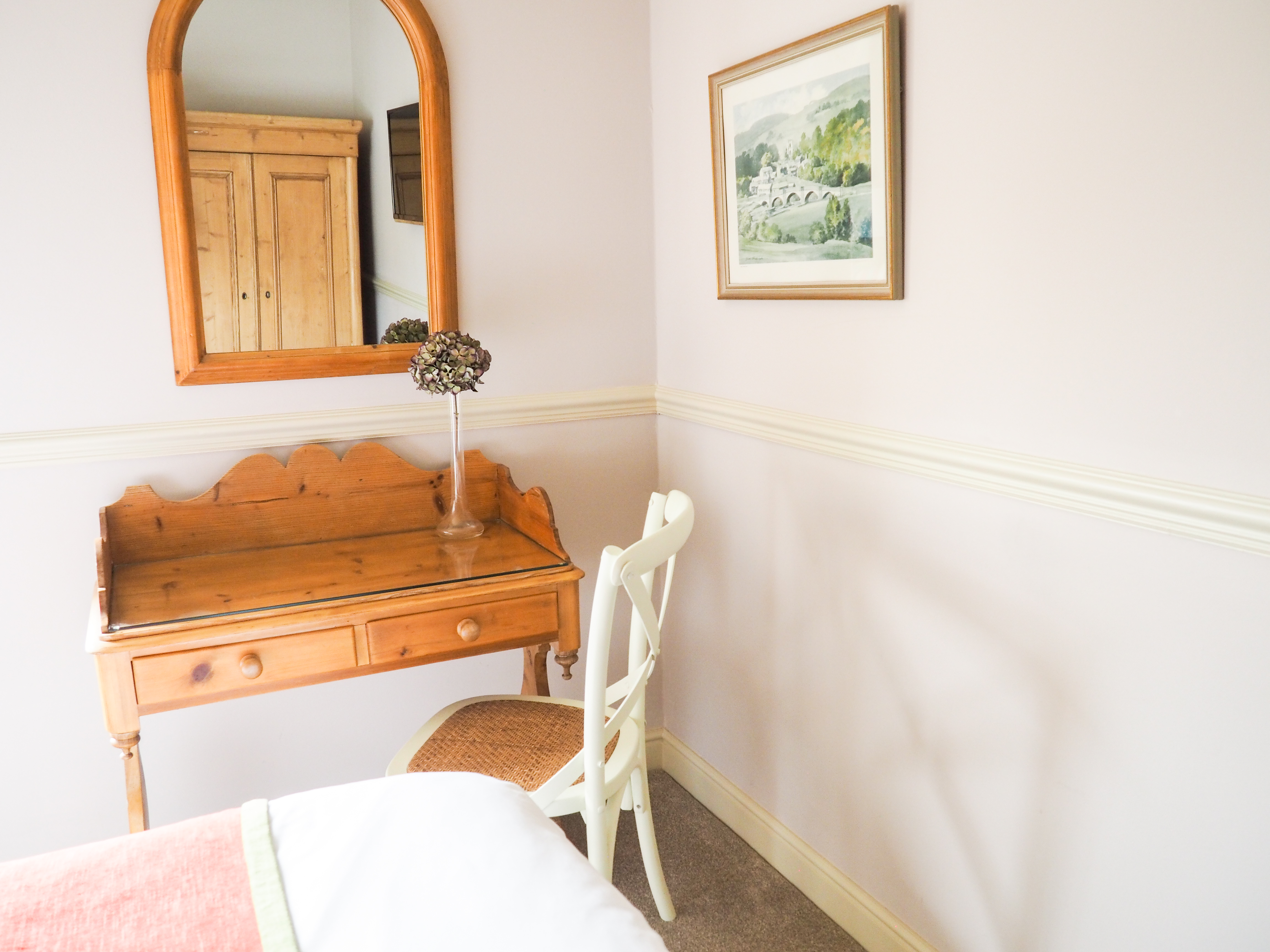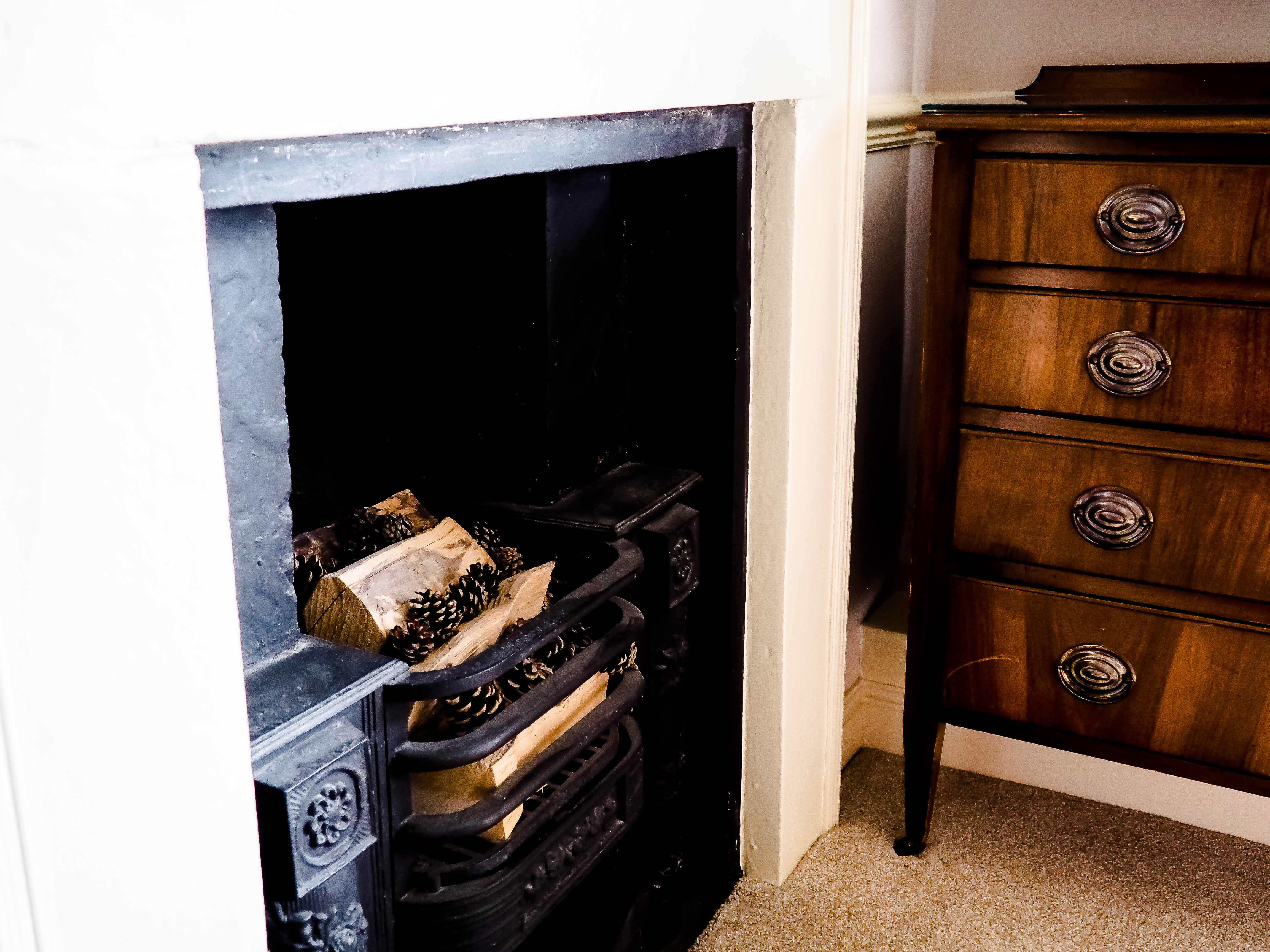 A cosy double bedroom with period features overlooking the side of the hotel, you can see the view from the windows in the photos.