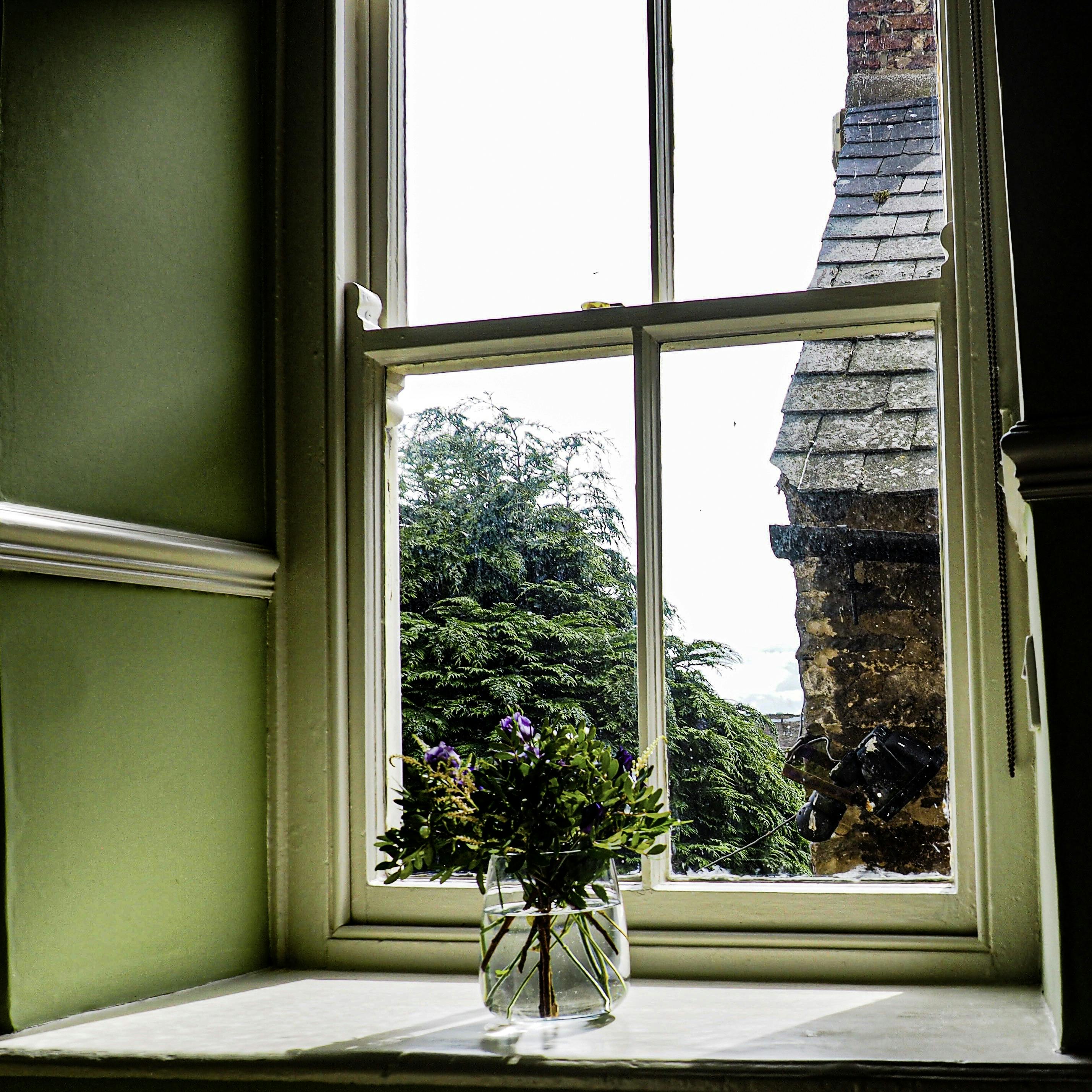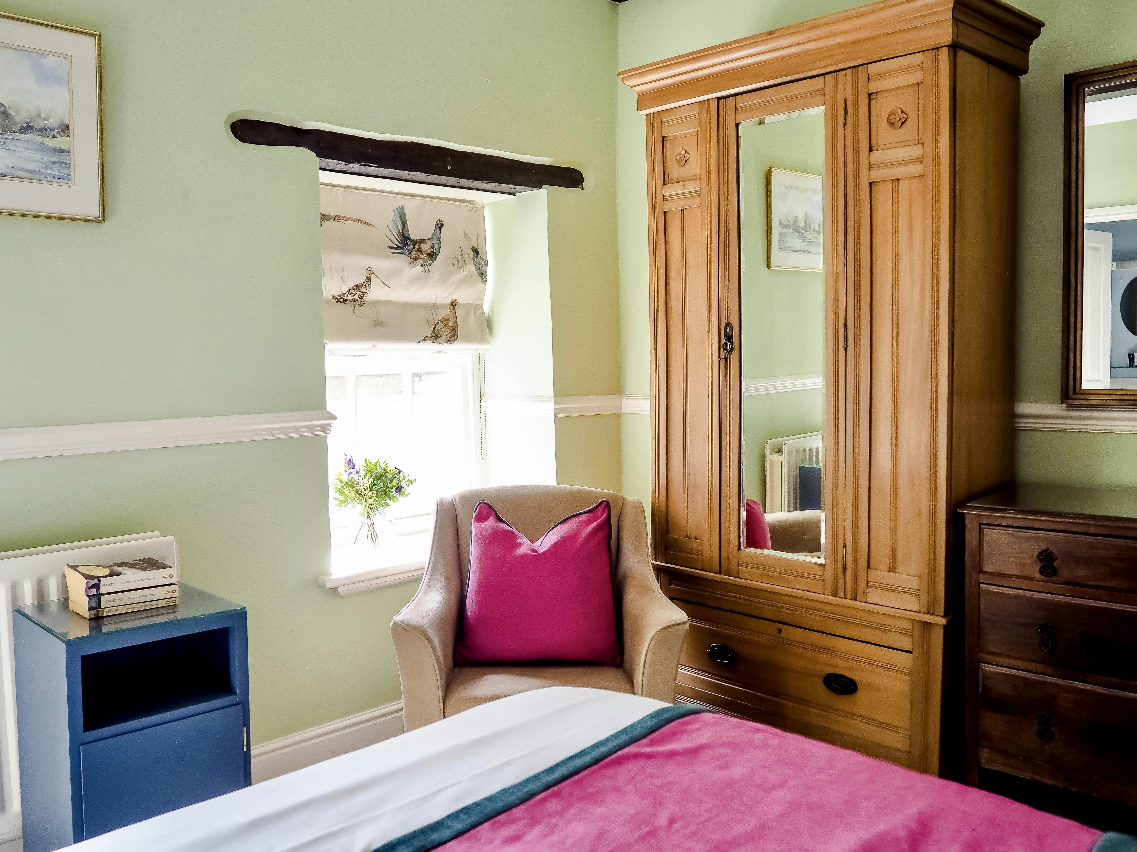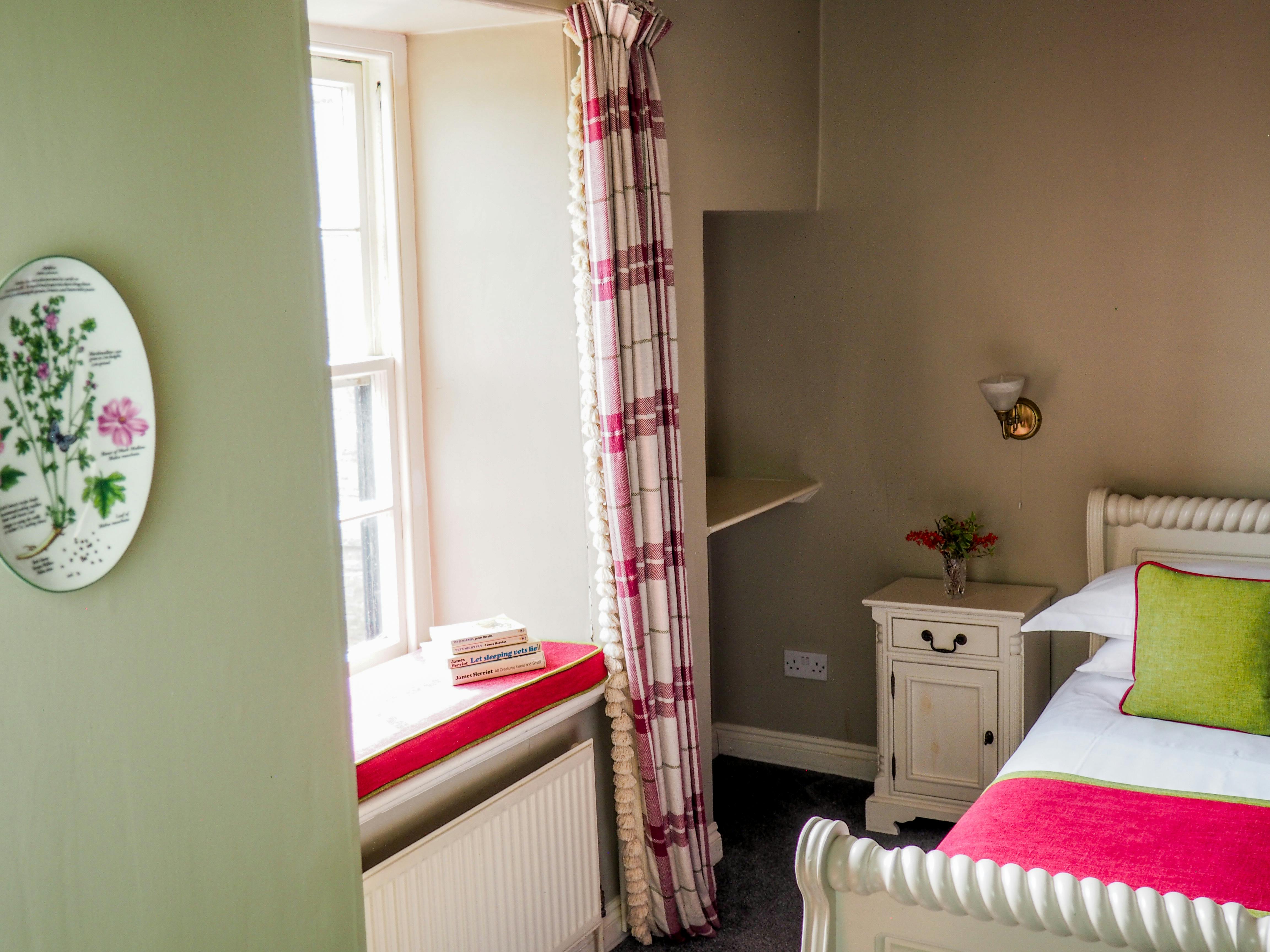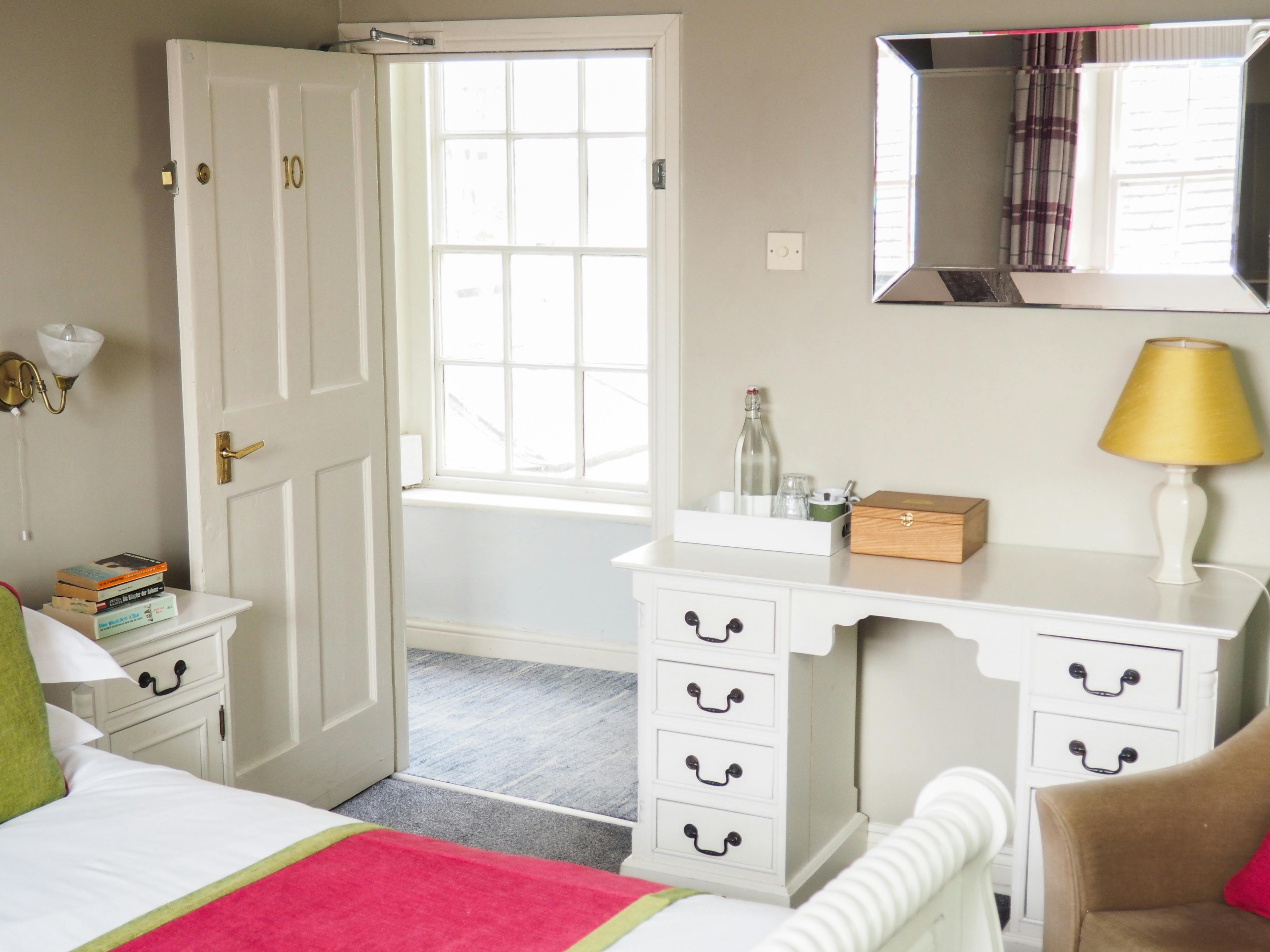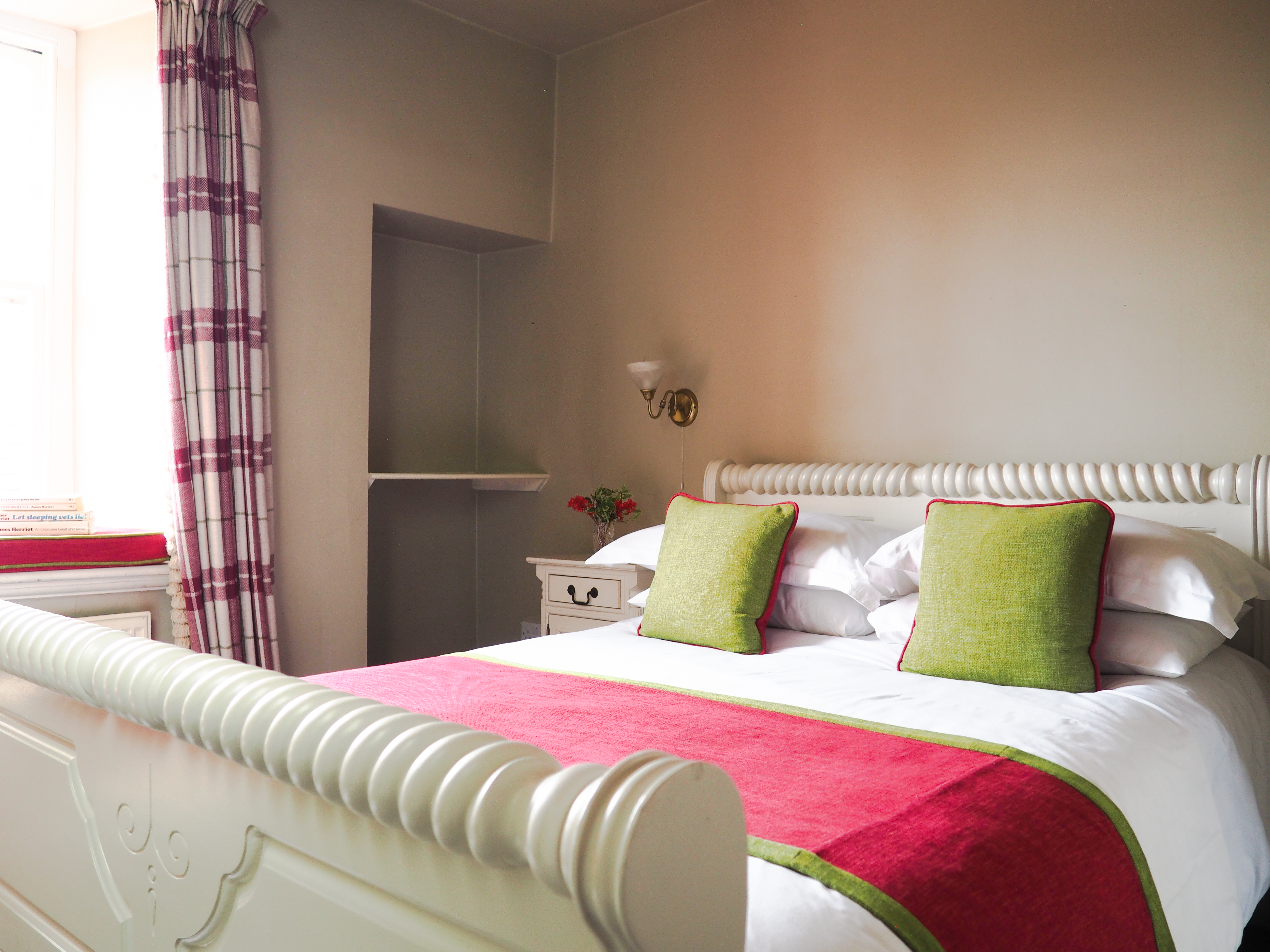 A cosy double bedroom with period features overlooking the side of the hotel, you can see the view from the windows in the photos.